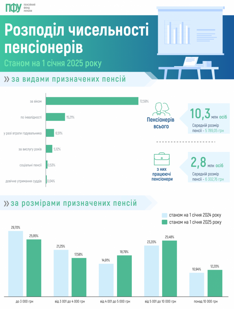 Станом на 1 січня 2025 року більш ніж половина українців отримують пенсії до 5 тисяч гривень. Водночас пенсії розміром понад 10 тисяч гривень отримували понад 1,2 млн українців. Це становить 12,2% від загальної кількості пенсіонерів (10 343 630 осіб).