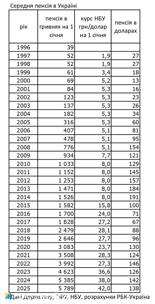 Офіційні дані свідчать, що у 1997 році середня пенсія в Україні складала 52 грн. До 2025 року вона зросла у 111 разів — до 5 789 грн. Але курс долара за цей період зріс у 22 рази — з 1,9 до 42 грн/дол.