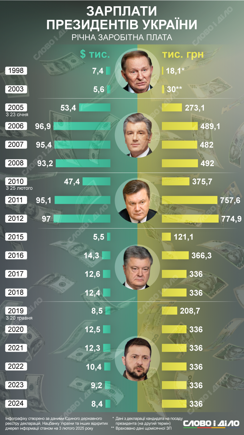 У 2020-2024 роках зарплата президента Зеленського не змінювалась — 336 тисяч гривень. Щоправда, через курсові коливання у доларовому еквіваленті її розмір помітно зменшився: 2020 рік — 12,5 тисяч доларів, 2021 рік — 12,3 тисячі, 2022 рік — 10,4 тисячі, 2023 рік — 9,2 тисячі, 2024 рік — 8,4 тисячі.