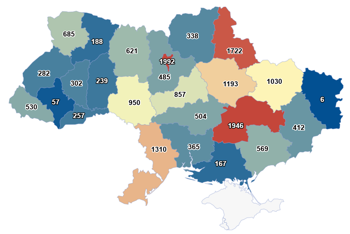 Перше місце у рейтингу посідає Київ — 1992 провадження. Далі йдуть Дніпропетровщина — 1946, Сумщина — 1722 та Одещина — 1310 проваджень.