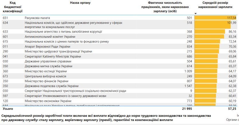 Найвищі зарплати серед центральних державних органів зафіксовано у Рахунковій палаті, де середній дохід становить 117,5 тисячі гривень (501 співробітник).