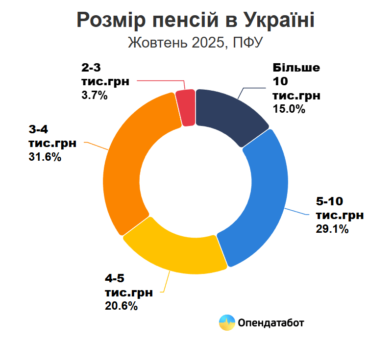 Водночас є й ті, хто отримує значно більше. Так, близько 1,5 мільйона людей, або 15% усіх пенсіонерів, мають середню виплату 15 750 грн — це приблизно 325 євро. Ще майже 3 мільйони українських пенсіонерів отримують, у середньому 6 860 грн, а 2,1 мільйона — лише 4 510 грн.