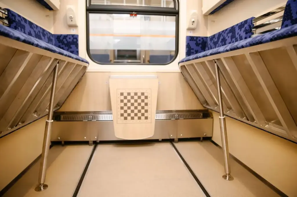 У кожному купе передбачили шахову дошку, а на верхніх полицях — індивідуальні столики з місцем для пляшки води або підсклянника.