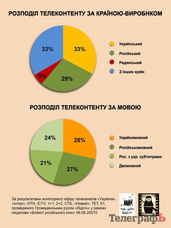 4 июня в Украине вступил в силу запрет показа фильмопродукции, произведенной в России с 2014 года, а также фильмов и сериалов, прославляющих спецслужбы и правоохранительные органы России и СССР.