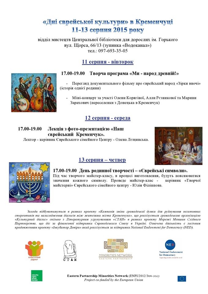У Кременчуці відзавтра, 11 серпня, у відділі мистецтв Центральної бібліотеки для дорослих імені Горького (вул. Щорса, 66/13) презентуватимуть єврейську культуру, повідомляють організатори ГО «Культурний Діалог» на своїй офіційній сторінці у соцмережах.