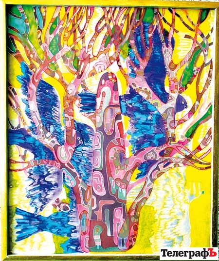 Інна Мосієнко – автор фантастично гарних батіків. Ми бігали від рожево-бузкового «Фазанячого дерева» до «Золотавої грушеньки», і натурально умлівали. На них можна дивитися годинами, як у дитячий калейдоскоп – і просто мліти від краси різнокольорових візерунків. Дуже декоративна штука ці батіки. Аж раптом ми натрапили на роботу, назва якої видалась нам дивно актуальною. Знаєте, як вона називалася? «Сині птахи, яких вистачить на всіх». Шикарна назва для генерації споживачів. Але то лише наша оцінка. Думки пані Інни плинуть зовсім іншими шляхами – ми не раз у цьому пересвідчувались. Тому вирішили уточнити, про що мова: