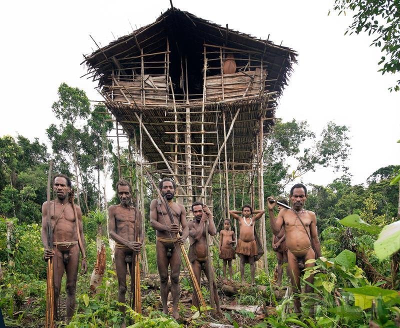 Банановые хижины раньше воздвигали очень высоко?–?и на отметке 40 метров над землей. Были случаи, когда люди падали и разбивались. Сейчас жилища строят ниже. Украшают дома костями съеденных животных. Взобраться в дом можно по тонкой бамбуковой лестнице, которую на ночь забирают. Вместе с ними в таком доме живут дикие свиньи, которых они не едят, а приручают и используют как ездовых пони. Детенышей диких кабанов женщины племени кормят своей грудью и каждый день забирают их наверх и спускают. Свиньи здесь вроде валюты. А особое лакомство у караваев?–?личинки сагового дерева?–?похожие на огромных жииииирных сочных грабаков.
