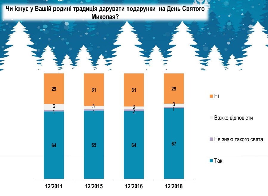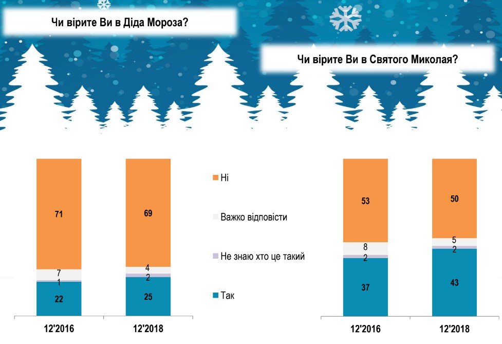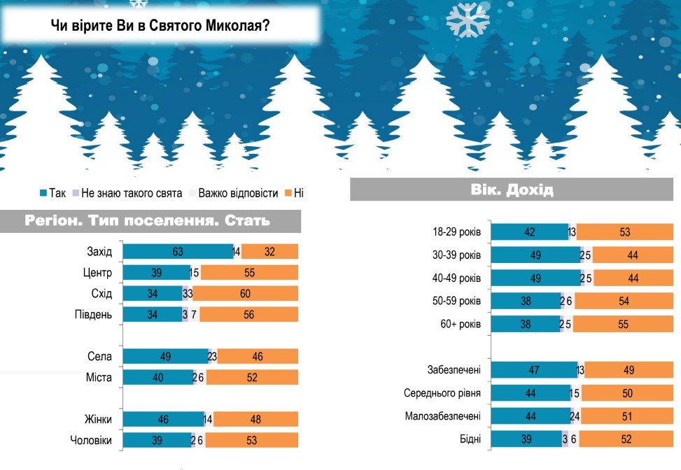 43% вказали, що вірять у Святого Миколая (проти 37% у 2016). Водночас половина заявили, що не вірять в нього. Найбільше вірять у Святого Миколая на Заході (63%), в інших регіонах таких трохи більше третини. Чим молодші та чим більш забезпечені респонденти, тим більше вони вірять в Святого Миколая. Цікаво, що більше половини опитаних віком від 30 до 50 років зазначили про свою віру у святого. Також більше їх серед жінок і мешканців сіл.