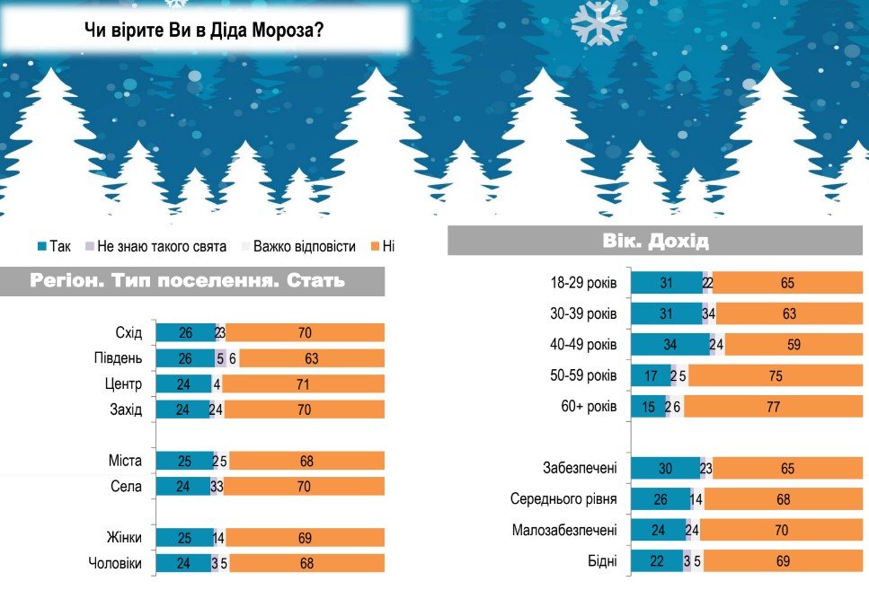 У свою чергу, в Діда Мороза вірять чверть опитаних українців, майже 70% – не вірять. У Діда Мороза більше вірять молодші й більш забезпечені українці.