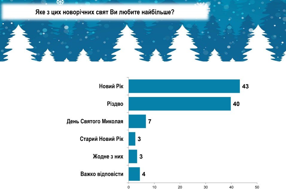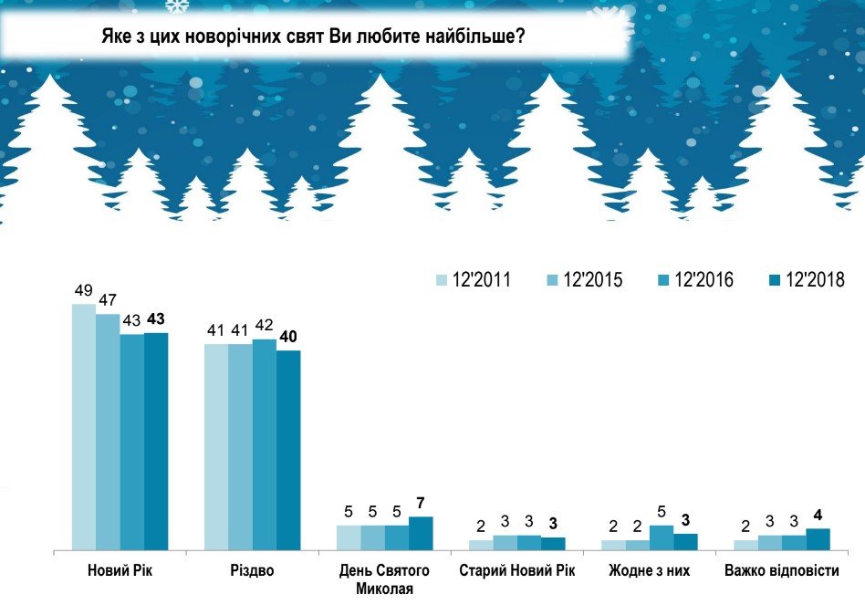 Більше 40% відзначили як найулюбленіші новорічні свята Новий Рік та Різдво. Ще для 7% опитаних таким є День Святого Миколая, 3% – Старий Новий рік. Тільки 3% не подобається жодне з перерахованих свят. За період опитувань серед новорічних свят зменшилася кількість тих, хто любить Новий рік (з 49% у 2011 до 43%).