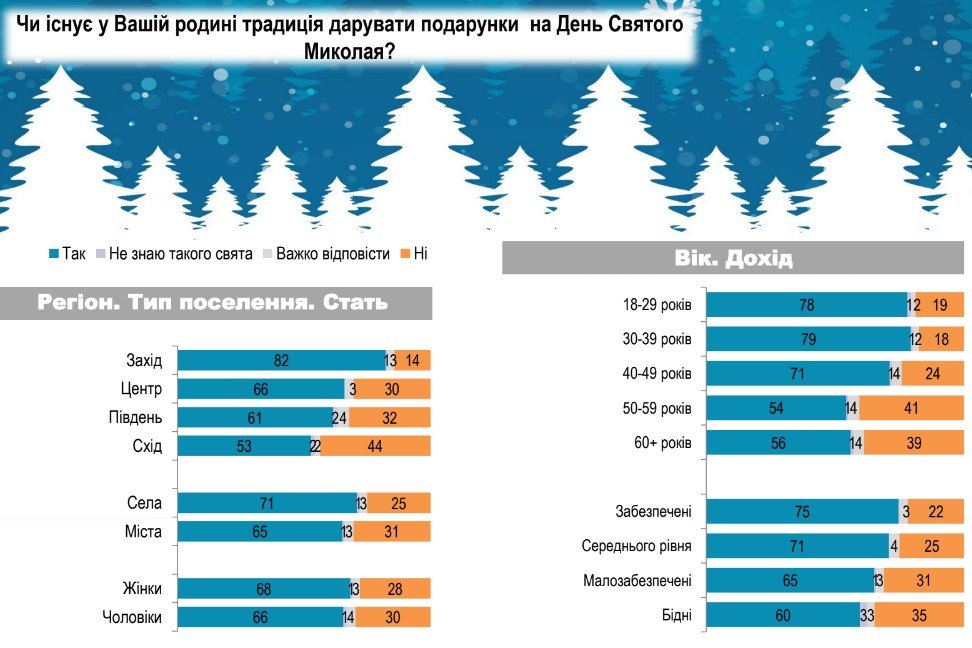 Найбільше прихильників традиції дарувати подарунки на День Святого Миколая на Заході (більше 80%). У Центрі і на Півдні таких дві третини опитаних, на Сході – половина. Більшою мірою підтримують дану традицію жителі сіл, молодь та більш забезпечені.