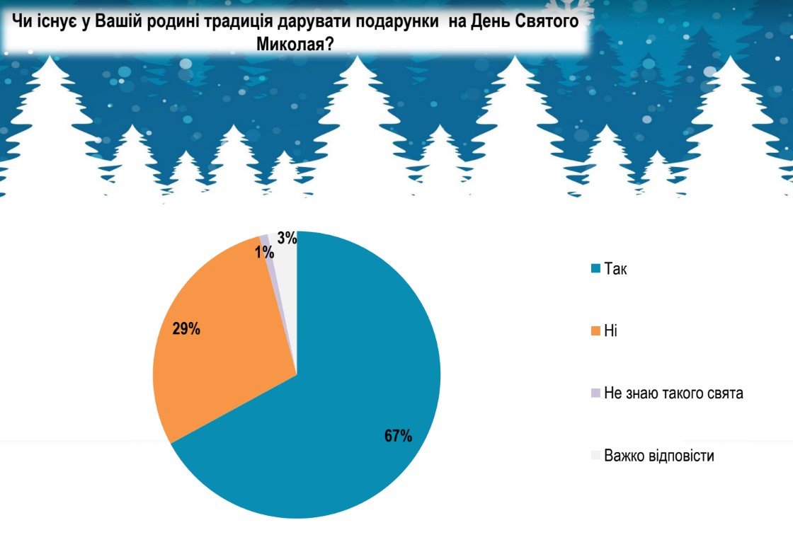 За результатами дослідження, майже 70% опитаних українців мають традицію дарувати подарунки на День Святого Миколая. Близько 30% – такої традиції не мають.