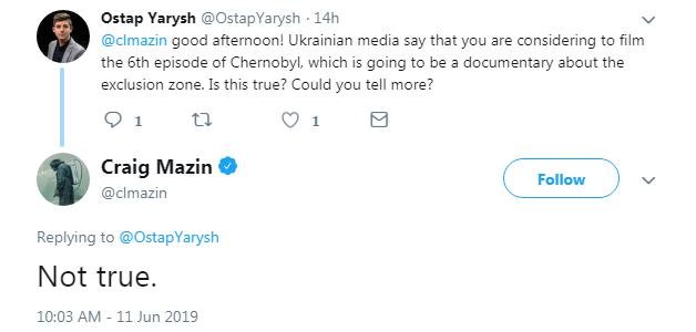 Цим він підтвердив, що шостої серії «Чорнобиля», який викликав справжній туристичний бум в Україні, не планують знімати.