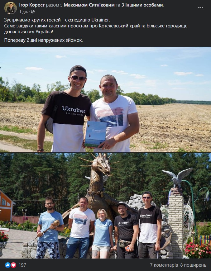 Команда Ukraїner знову подорожує Полтавщиною. Недавно знімали на Котелевщині і Більському городищі. Про це повідомив директор Історико-культурного заповідника «Більськ» Ігор Корост на своїй сторінці у Facebook.