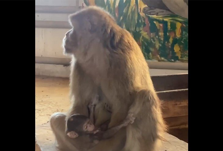 Близько 5 днів тому на Полтавщині в екопарку у Ковалівці у сім’ї макак маготів народилось мавпеня. Маля має темну шерсть та білу пляму на голові.