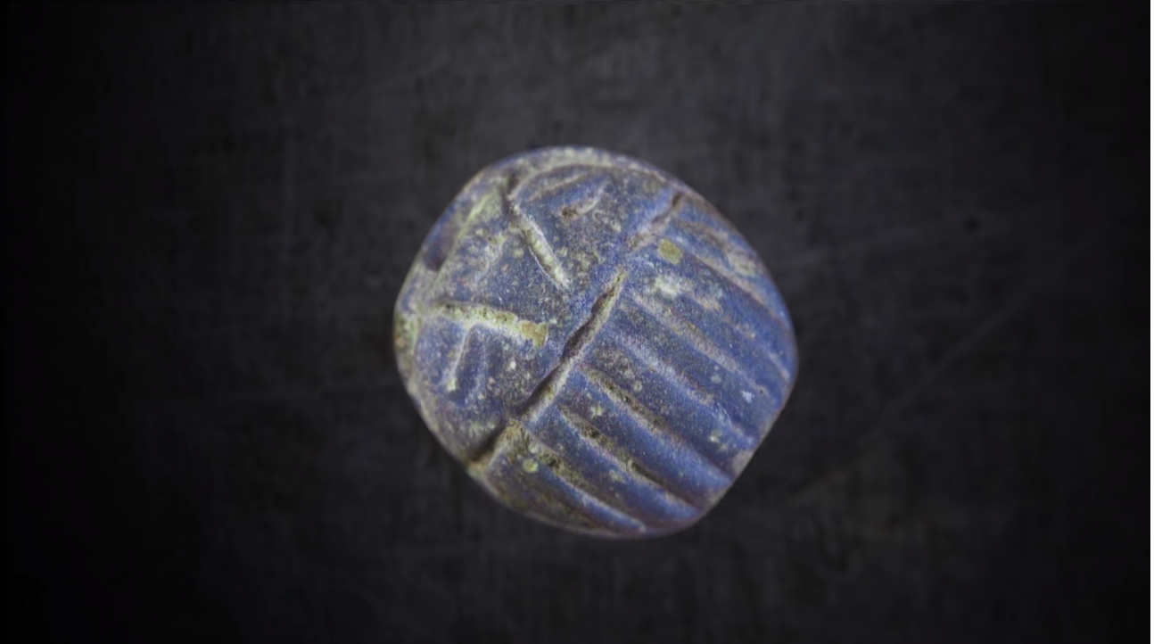 Підвіска виготовлена з темно-синього єгипетського фаянсу і колись була частиною намиста зі скляними пронизками. У релігії Давнього Єгипту скарабей був символом бога сонця – Хепрі.
