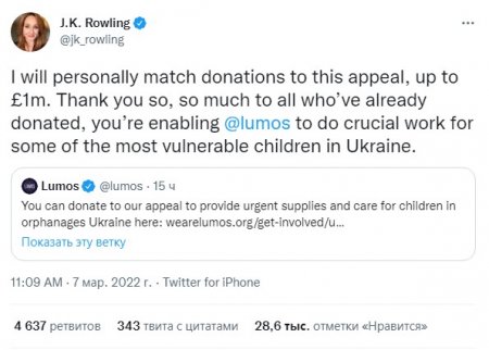Відома на весь світ британська письменниця Джоан Роулінг разом зі своєю благодійною організацією Lumos зібрала для українських дітей, які постраждали від російської агресії, 1 мільйон фунтів стерлінгів - приблизно 1,3 мільйона доларів.