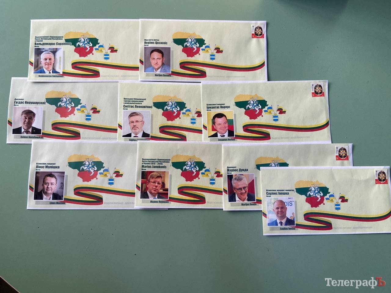 До першого випуску конвертів включені конверти, присвячені Надзвичайним і Повноважним Послам Литви в Україні Пану Маріюсу Януконісу, Вальдемарасу Сарапінасу, відомим дипломатам пану Гвідасу Керушаускасу та пану Маріюсу Дунде, меру міста Алітус пану Неріюсу Цесюлісу, видатним представникам литовського бізнесу пану Сігітасу Леонавічусу, Саулюсу Івошку, Лінасу Малішку та Ірмантасу Норкусу.