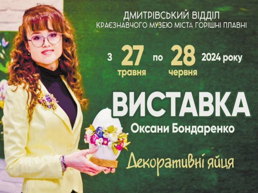 У відділі музею в Дмитрівці експонується частина робіт із першої персональної виставки мисткині, яка працює художником у міському Палаці культури Кременчука. Це шість декоративних панно. Роботи невеликі за розмірами, виконані в різних техніках: ліплення з гіпсу, декупаж, розпис та живопис. Про це розповіла керівниця Дмитрівського відділу краєзнавчого музею Горішніх Плавнів Оксана Прибутько.