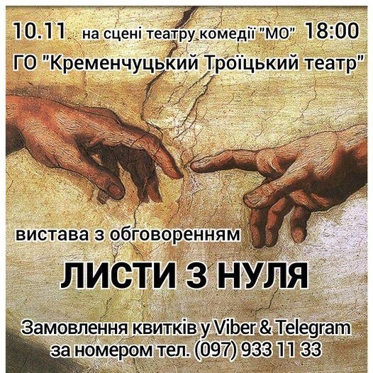 Цієї неділі, 10 листопада о 18.00, у театрі комедії «МО» в Кременчуці відбудеться прем’єрний показ вистави-дискусії «Листи з нуля», створеної за реальними листами з фронту. Вистава поставлена колективом і друзями «Троїцького театру» для показу в місті-побратимі Тюбінгені, Німеччина.