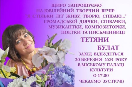 20 березня о 17.00 у Міському палаці культури відбудеться творчий вечір Тетяни Булат — поетки, режисерки, керівниці народного вокального гурту «Крила».