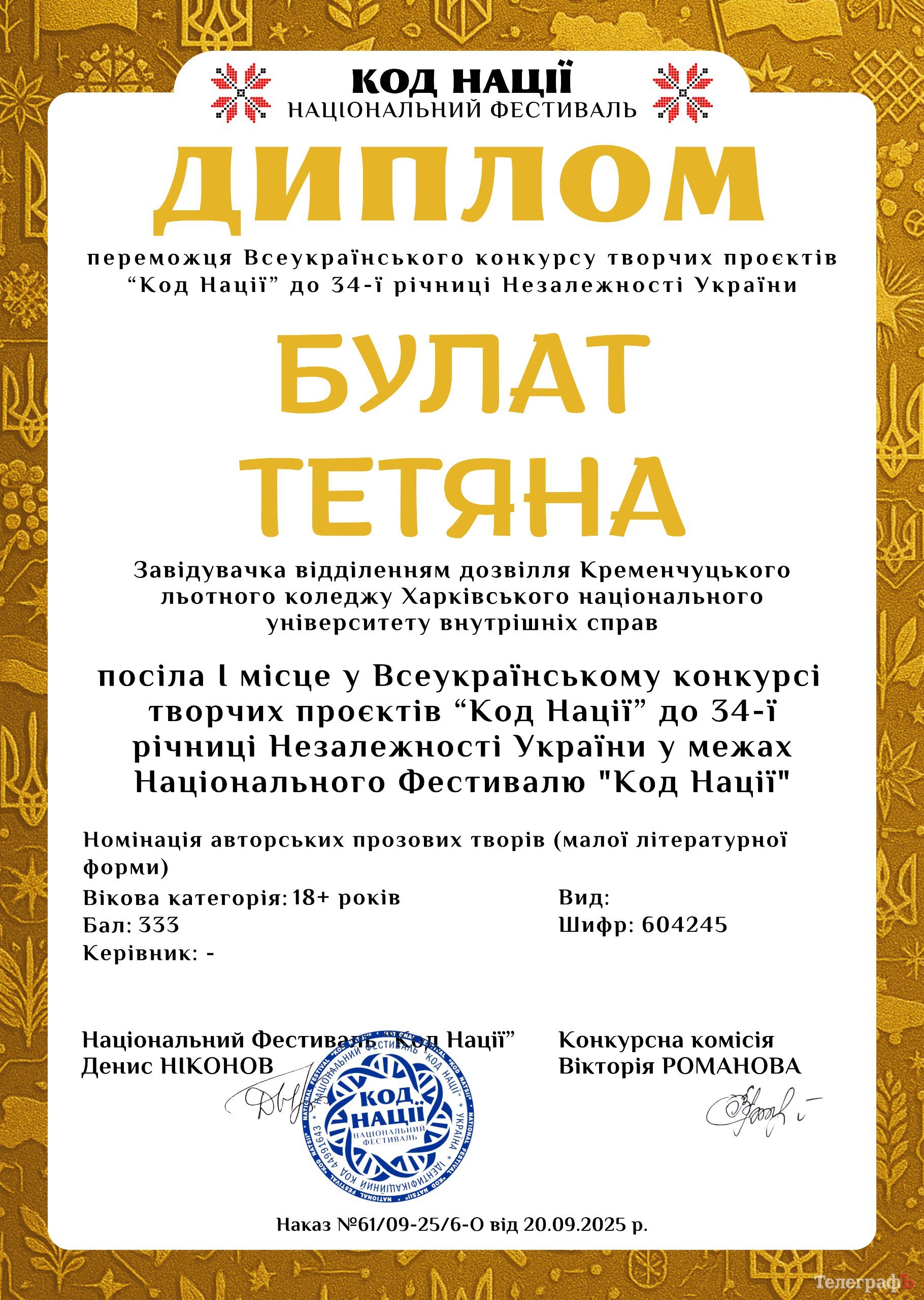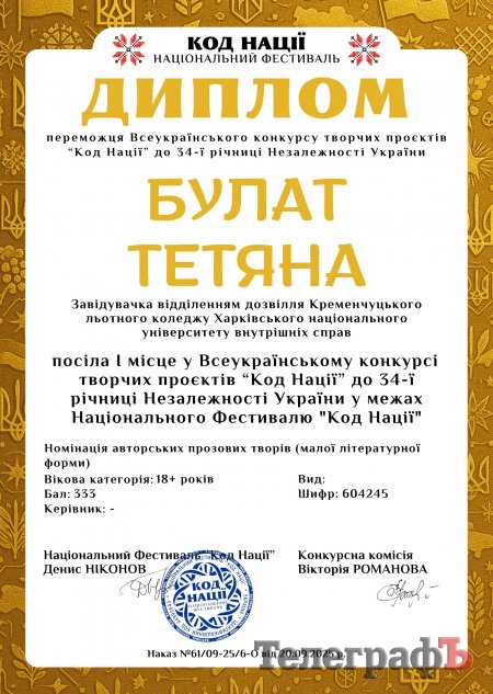 Також у номінації авторських прозових творів дипломом переможця нагороджена керівниця «Крил», завідувачка відділенням дозвілля Кременчуцького льотного коледжу Тетяна Булат.