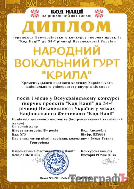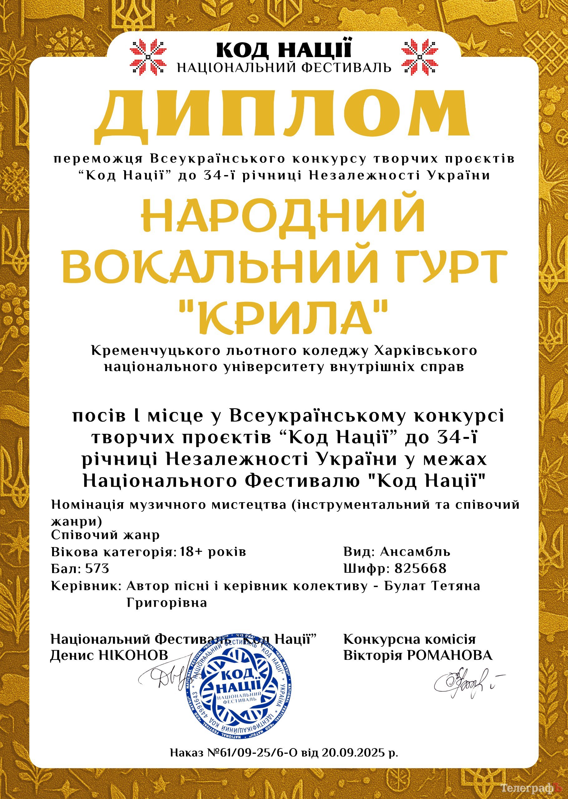 Народний вокальний гурт «Крила» Кременчуцького льотного коледжу під керівництвом Тетяни Булат став переможцем престижного конкурсу. Гурт посів перше місце у Всеукраїнському конкурсі творчих проектів «Код нації» до 34-ї річниці Незалежності України у межах національного фестивалю «Код нації» у номінації музичного мистецтва, співочий жанр.