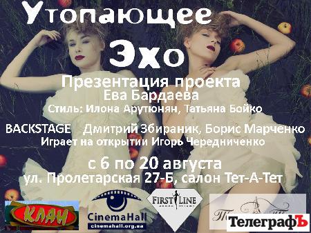 Выставка «Утопающее эхо» откроется с салоне «Тет-а-Тет» 6 августа. Это творческий проект фотографа Евы Бардаевой, в котором ей помогали мастера салона, школа имижда «First Line» и другие. Будет представлено 11 фоторабот размером 51х70см.