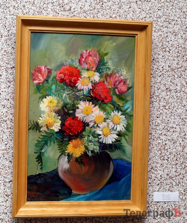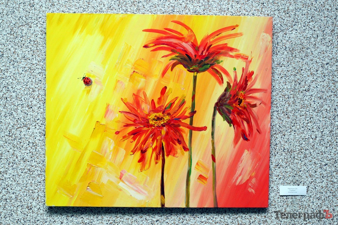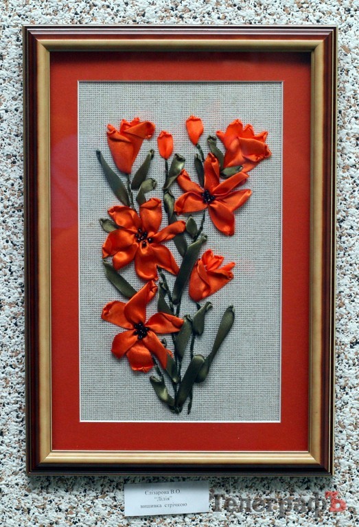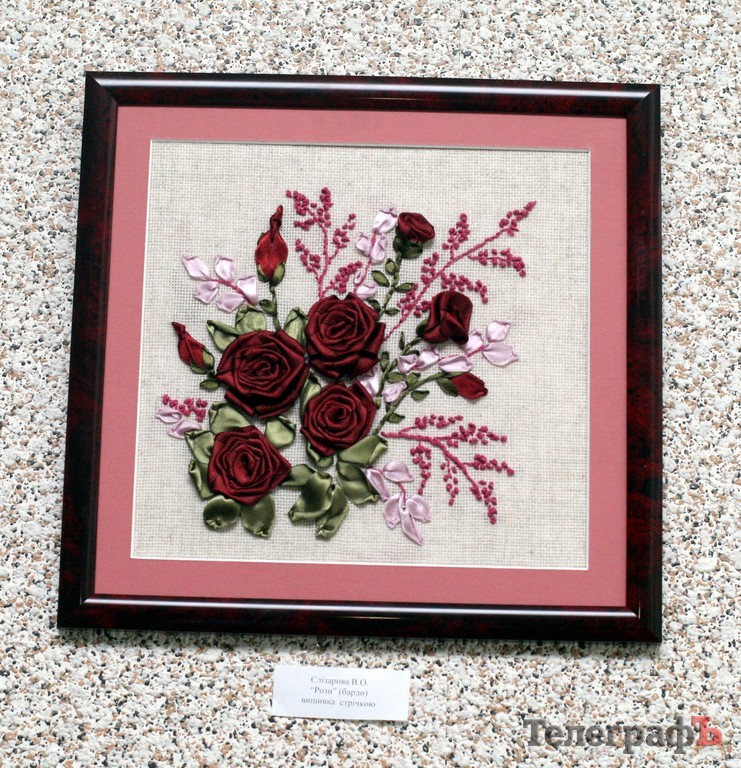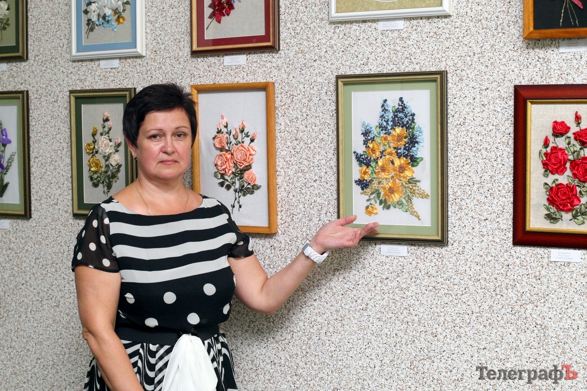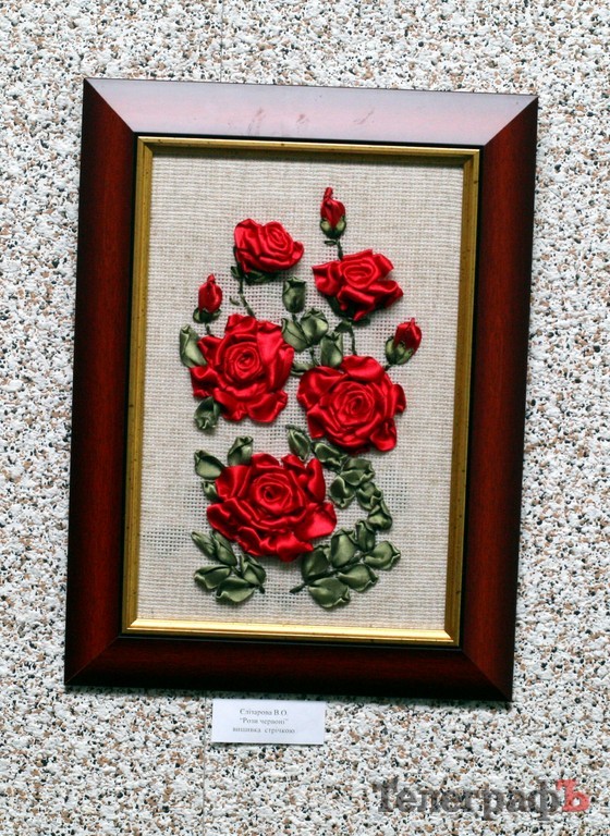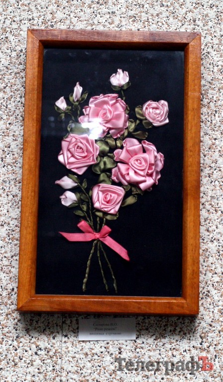 На выставке есть картины, написанные маслом, а также вышитые атласными ленточками.