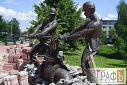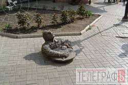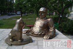 А це вже наші рідні кремнчуцькі сантехніки. Два кремезних чоловіки сумлінно крутять «колесо» водонапірної засувки біля будівлі КП «Міськводоканал». Цю скульптуру ми отримали як подарунок на 435-й день народження міста та 95-у річницю «Міськводоканалу». Наразі сантехніки не дуже готові приймати гостей ? біля них мостять тротуар.