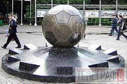 Харків. Пам’ятник футбольному м’ячуна алеї саду Шевченка. Бронзового м’яча діаметром у півтора метра встановлено на місці, де зазвичай не один рік поспіль у недалекому минулому збиралися харківські футбольні фанати.