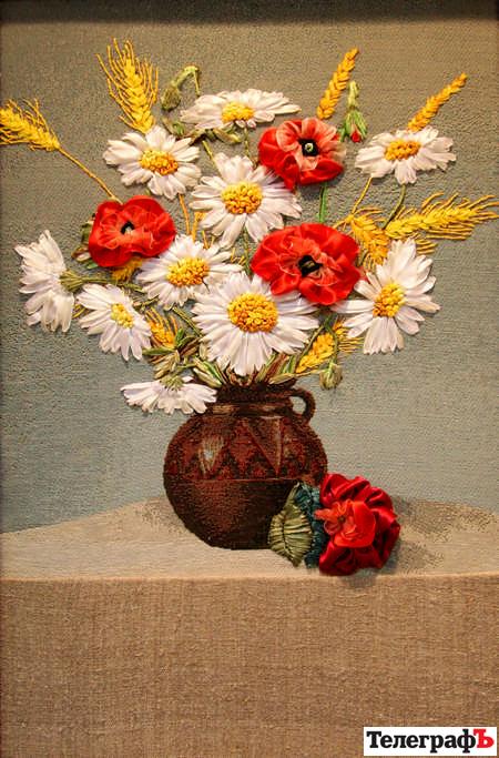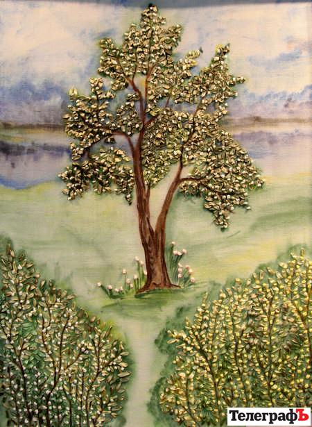 Вишивка стрічкою – старовинна техніка. Власне, найстаровинніша у світі. Брутальна первісна людина прикрашала свій перший одяг саме стрічковою вишивкою. Вишивали смужками шкіри та – страшно сказати – жилами тварин! Хоча що ще можна чекати від первісної людини? Втім, доісторичні жахи залишились далеко позаду. Уже років 300 умільці вишивають виключно шовковими стрічками – жодних жил. Вишиває стрічками і автор робіт – Валентина Анатоліївна Наріжна. Вона розповіла «Телеграфу», що почала вишивати стрічкою п’ять років тому. Раніше нічого про це мистецтво не знала. Та якось на День вчителя чоловік подарував їй книжку із симпатичними картинками. Звідти пані Валентина і дізналась про стрічкову вишивку. Так, по книжці, засвоїла і техніку. Навчила вишивати стрічкою спершу свою 14-річну дочку, а потім купу вчителів Кременчуцького району – там існує ціле творче об’єднання вчителів трудової освіти, які вишивають, розписують батики, роблять картини з товченого скла та інші дива.