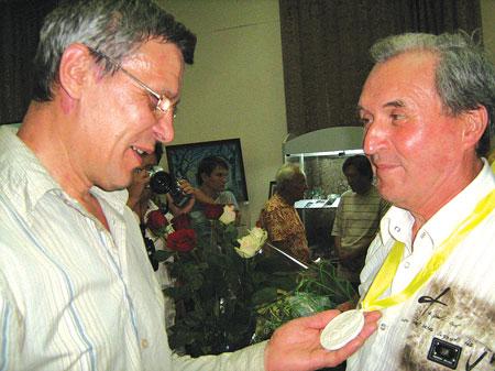Художник Кобеляцький (зліва) зацікавлено роздивляється пам’ятну медаль Опанаса Сластьони. Її Анатолію Дяченку (справа) за серію ілюстрацій до «Енеїди» вручив голова обласної Спілки художників.