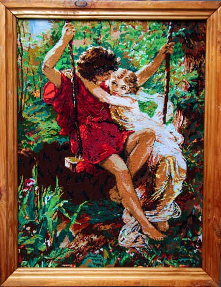 «Телеграф» поцікавився у пана Володимира, яка з робіт дружини подобається йому найбільше? Чоловік повів нас до величезної торби, і дістав звідти яскраву вишивку із пасторальним сюжетом – двоє закоханих сидять на гойдалці і мліють від сонця та кохання. Трохи зніяковівши, пан Володимир сказав, що їхні з пані Тетяною діти кажуть, що це «портрет мами та тата у молодості». До речі, дітей у сім’ї Мкртчян троє, а живе подружжя разом вже 43 роки. Тож, схоже, діти точно впізнали героїв пасторальної вишивки.
