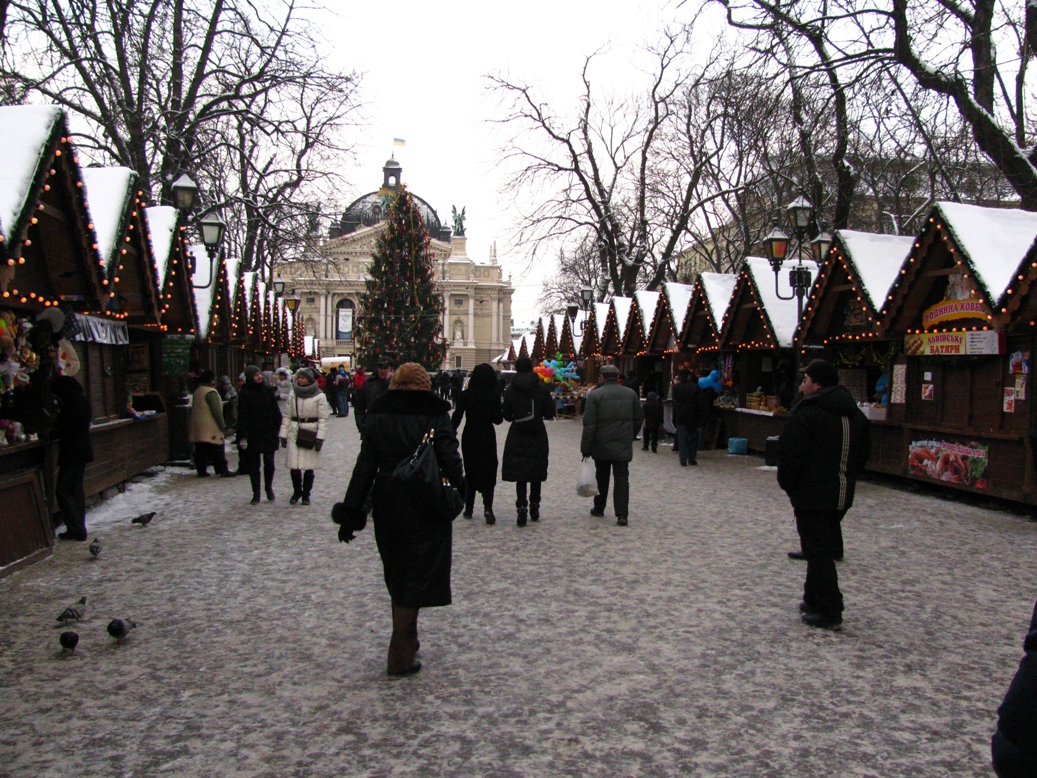 Біля ратуші та оперного театру вишукувалися хатки із наїдками-напоями-сувенірами та іншим туристичним дріб’язком. Найпопулярніші смаколики – пампушки (3-10 грн). Напої свята – медовуха та глінтвейн (по 10 грн за стаканчик). Головне – не додуматися прийти сюди ввечері 6 січня. Тут жодного продавця – всі по домівках за святою вечерею. А хто вже прийшов, той може помилуватися святковою ілюмінацією та «заправитися» у найближчих фастфудах. Ці працюють, для них нічого святого немає:)