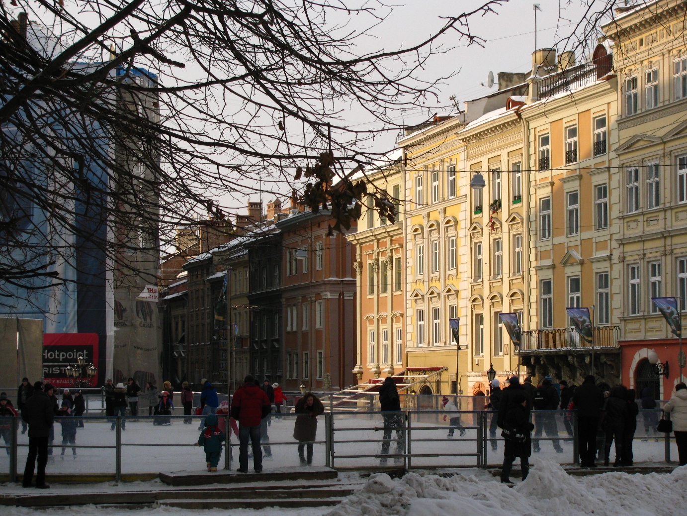 Оскільки Різдво цього року видалося без снігу та морозу, то традиційна ковзанка біля львівської ратуші користувалася шаленим попитом. Кому не вистачало терпіння вистояти півгодини в черзі – йшли подивитися на лід і сніг у спеціальний павільйон із льодовими скульптурами