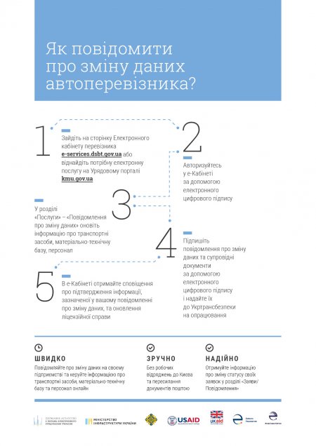 Разом із запуском послуги е-Кабінету стають відкритими дані Реєстру перевізників, який веде Укртрансбезпека. Відтепер кожен громадянин, ввівши номер автомобіля, ЄДРПОУ чи ІПН власника, зможе дізнатися точну назву та контактні дані перевізника, а також наявність, тип та строк дії його ліцензії. Така можливість зробить подорожі пасажирів безпечнішими, захистивши від ризику обрати перевізника, у якого відсутня відповідна ліцензія.