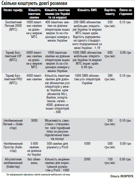 Кожен оператор намагається привабити клієнтів своїми тарифами. За останні роки розмови в мережі одного оператора дійсно стали доступнішими. Приміром, МТС має таку послугу як «Супер» - розмовляти можна до 40-50 хвилин безкоштовно і без плати за з'єднання, щоправда, за 25 днів таких розмов треба сплатити 30 гривень. Дзвінки на інших операторів коштують 1,37 грн за з'єднання.