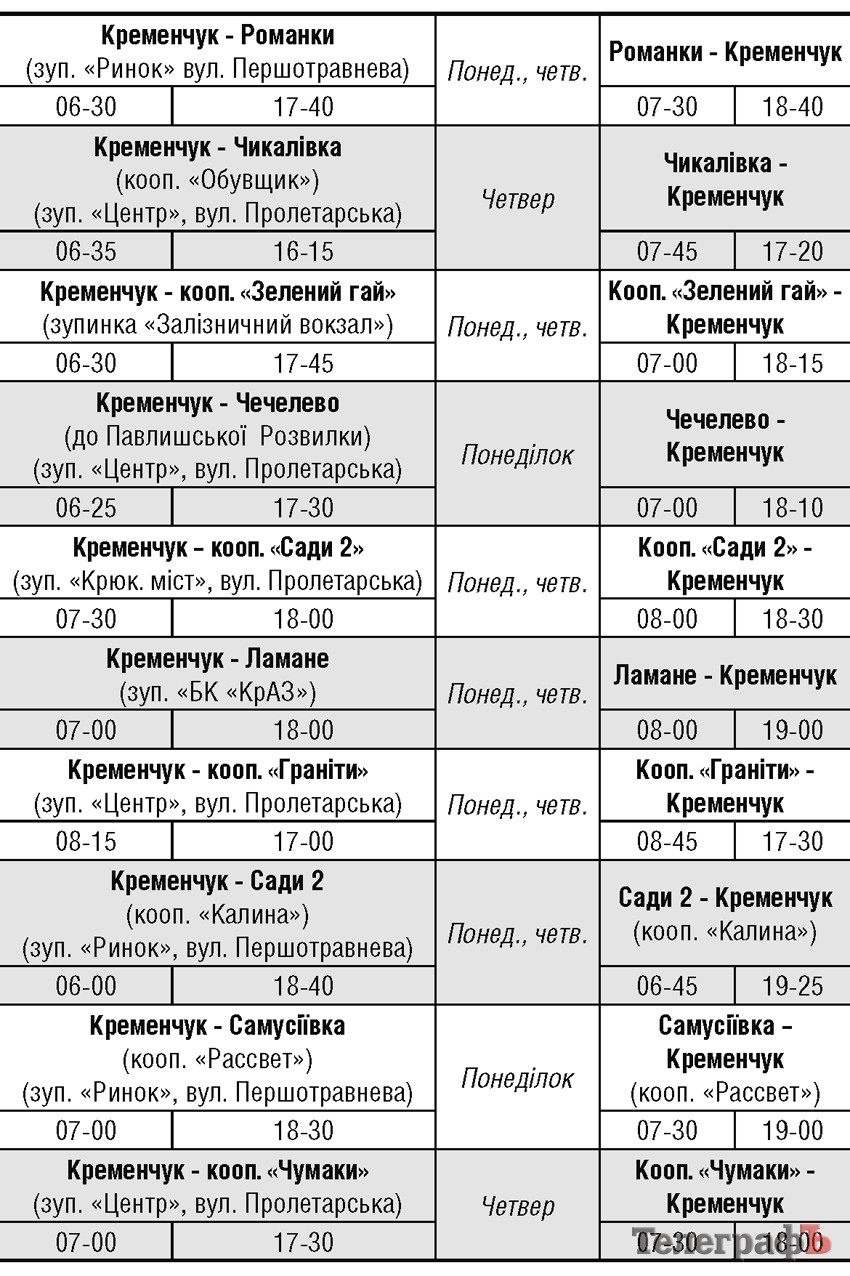 Кременчуцька мерія затвердила перелік рейсів для безкоштовного перевезення малозабезпечених верств населення на садово-городні ділянки. Пільгові автобуси будуть їздити по понеділках та четвергах, починаючи з 26 квітня 2012 року.