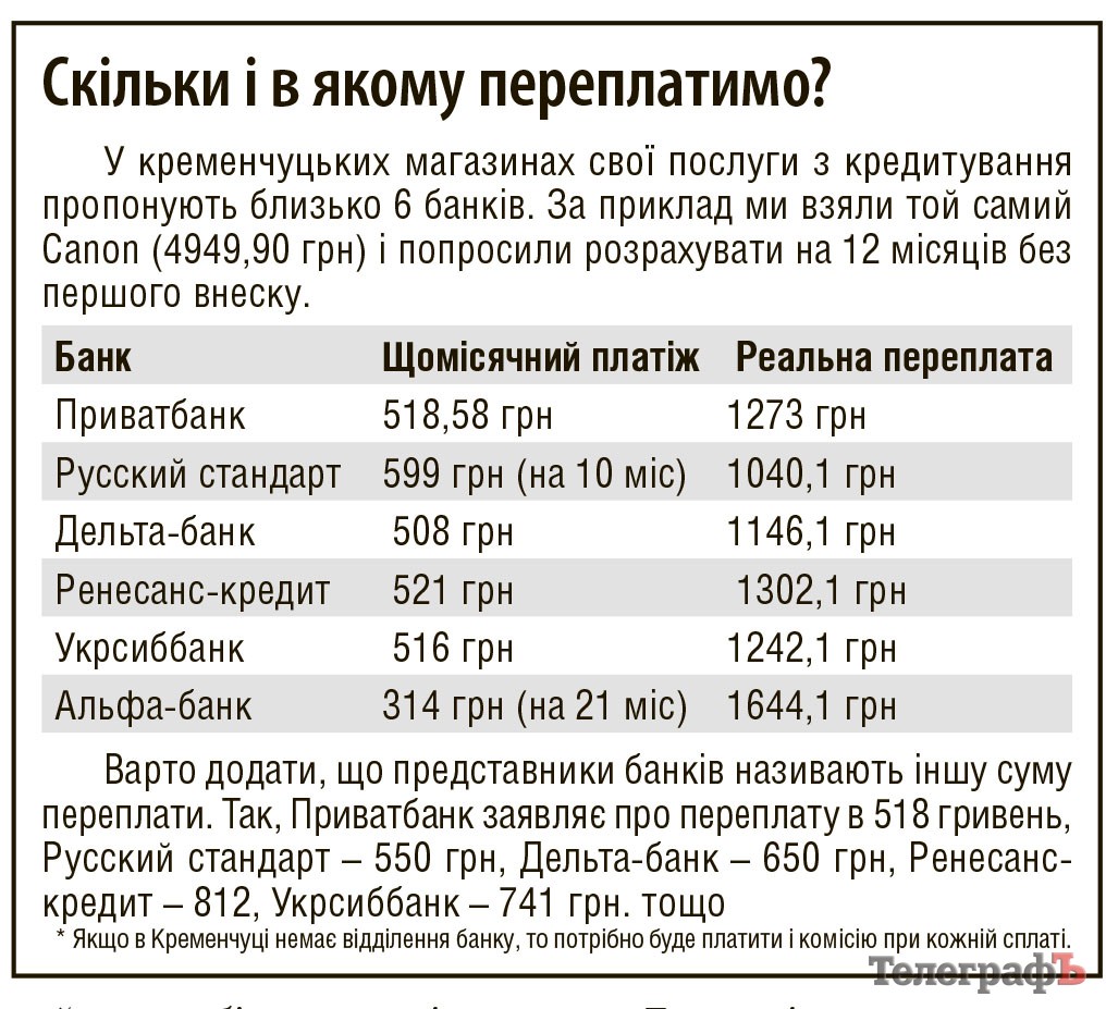 – Я вирішила купити фотоапарат, – розповідає кременчужанка Ольга. – Дуже привабило слово «розстрочка», ніби у радянські часи. Є сума, яку треба платити частинами. Не те, що кредит – дорого і складно. Проте вийшло, що при розстрочці також є переплата, не менша, ніж відсотки по кредиту. Чому ж одразу не кажуть: за розстрочку треба заплатити певну суму?