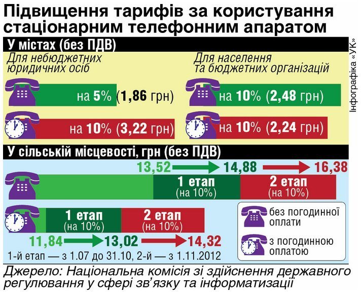 – За пользование основным телефонным аппаратом для населения в сельской местности на 10% на первом этапе (с 13,52 до 14,88 грн. Без НДС без почасовой оплаты и по 11,84 до 13,02 грн. Без НДС с повременной оплатой) . На втором этапе – еще на 10% (с 14,88 до 16,38 грн. Без НДС без почасовой оплаты и по 13,02 до 14,32 грн. Без НДС с почасовой оплатой).