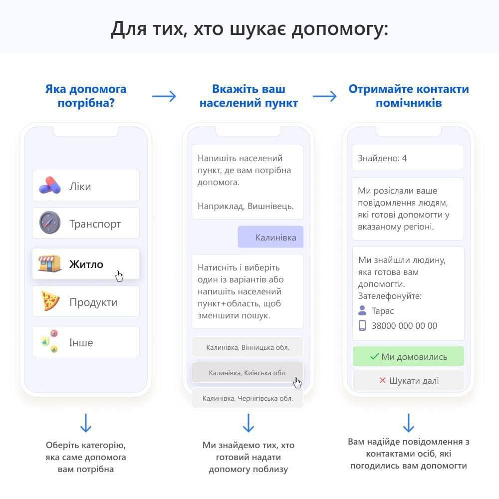 Система автоматично знаходить потрібних людей серед зареєстрованих і відправляє їм повідомлення із запитом про допомогу. Коли людина погоджується допомогти, система відправляє її контакти людині, що зараз в біді.