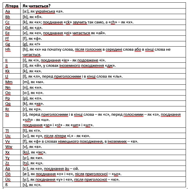 Абетка у німецькій мові складена з латинських літер, яких загалом 26. Одразу відзначимо, що фонетика легша, ніж у англійській: вимова звуків збігається з їхнім написанням, чіткий звук «р» та майже відсутні ситуації, коли одна й та сама комбінація слів звучить інакше в різних словах. Тепер розглянемо німецький алфавіт детальніше, зокрема, як правильно читати літери.