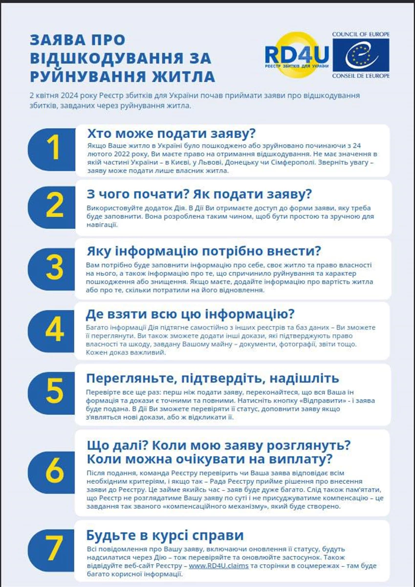 Для подання заяви треба бути власником майна, яке зареєстроване в Державному реєстрі речових прав (ДРРП), і мати Акт про обстеження від місцевої влади. Згодом заяви зможуть подати інші власники зруйнованого чи пошкодженого майна, зокрема ті, чия нерухомість розташована на тимчасово окупованих територіях.