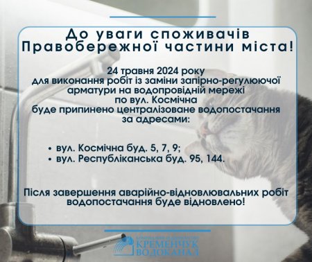 24 травня, у зв'язку з виконанням робіт із заміни запірно-регулюючої арматури на водопровідній мережі в районі вул. Космічна, буде тимчасово припинено централізоване водопостачання за наступними адресами: