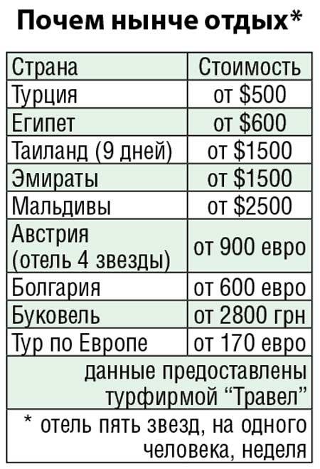 Сезон отдыха в Египте вскоре подойдет к концу. Директор турагентства «Травел» Виктор Горелов говорит, обычно в этот период цены снижались, появлялись горящие путевки. Но сейчас этого не произошло опять-таки из-за уменьшения количества рейсов. Как дальше будет складываться ценовая политика, зависит от того, добавят количество вылетов или нет. Но как бы там ни было, Египет для тех, кто хочет тепла, – самый реальный вариант (в среднем, $500-600 на человека). Потому что даже подешевевшая далекая экзотика из-за стоимости авиаперелета все равно остается недоступной для среднестатистического украинца.