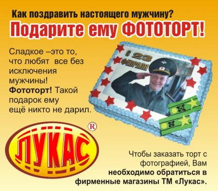 Сладкое –это то, что любят все без исключения мужчины! Фототорт! Такой подарок ему ещё никто не дарил. Чтобы заказать торт с фотографией, Вам необходимо обратиться в фирменные магазины ТМ «Лукас».