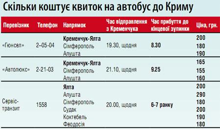 У «Гюнселі» нам повідомили, що вартість проїзду до Ялти у цьому випадку становитиме 250 грн, зробити замовлення можна у представництві фірми у Кременчуці, на автовокзалі. У «Автолюксі» пояснили, що таке замовлення потрібно робити лише через сайт компанії, оплата через Інтернет. У результаті вартість переїзду Київ-Ялта виходить близько 270 грн.