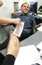 – Я пробовал, правда врут, – комментирует сотрудник «Приватной газеты», который пришел на запах лака. – Вот из носа волоски выдергивать – это больно. Вы ему лучше ноги эпилятором побрейте. Вот это по-настоящему круто. Чтоб усилить эффект, вы ему в зоне бикини волоски удалите… воском, – издевается сотрудник.