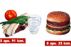 Оскільки ‘Макдональдс у Кременчуці досі не відкрили, ми спорудили страву з національних продуктів і назвали її “сальбургер”. Інгредієнти: сало – 136 гр – 2 грн. 99 коп. (за 22 грн./кг); хліб – 76 гр – 16 коп. (за 1 грн. 40 коп.); помідор і цибуля – з сусідського городу (безкоштовно); горілка – 50 гр – 76 коп. (7 грн. 60 коп. за пляшку). Всього – 3 грн. 91 коп. Запитаєте, до чого тут горілка? А який український “сальбургер” без горілки?! І скажіть тепер, будь-ласка, навіщо нам оті біг-маки при нашій зарплаті?